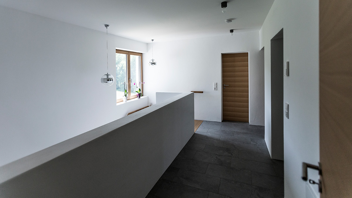 Das von Renaltner verbaute Zimmertürsystem mit Stahl-Eckzarge gibt das Gefühl einer komplett wandbündigen Fläche. Da die Zimmertürblätter hier bewusst in Eiche geliefert wurden, ist eine stimmige Wandfläche inkl. Wandkontrast entstanden. Durch die verdeckten Bänder, die wandbündige Konstruktion und die Robustheit bzw. hohe Langlebigkeit der Stahlzargen bietet Renaltner mit diesem System ein vollkommenes Produkt, das auch preislich deutlich günstiger ist als vergleichbare wandbündige Türen.