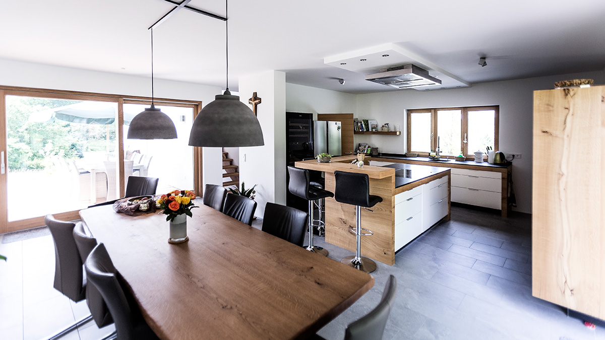 Auch die Konstruktion der zwei Hebe-Schiebe-Türen erfolgte in Symmetrie. Der Vorteil für den Kunden ist der barrierefreie Übergang zu beiden Terrassen.